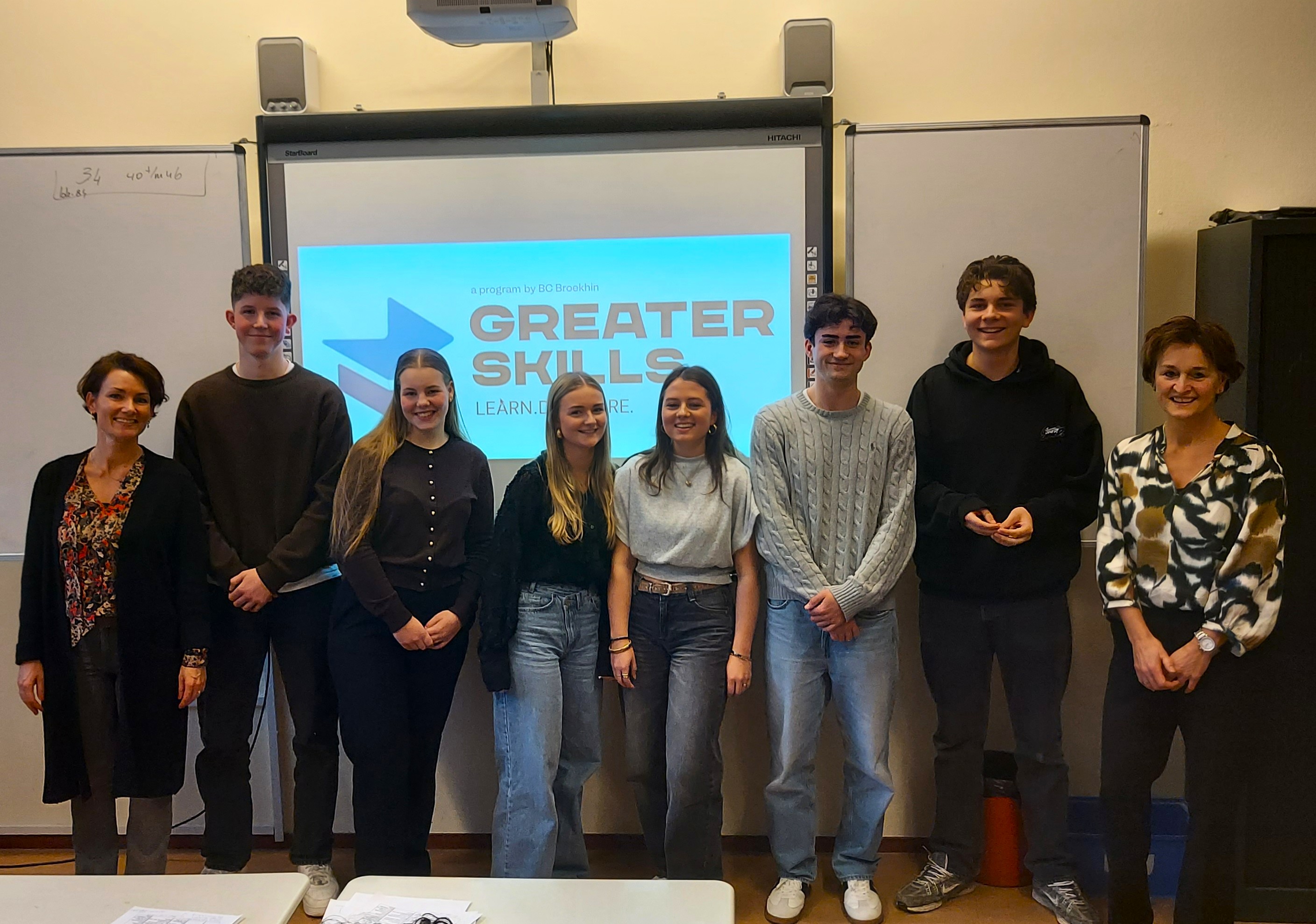 Mevrouw Rams (coach Greater Skills), Nick, Evy, Noa, Lotte, Bram, Zef en mevrouw Engelen (directeur BC Broekhin).